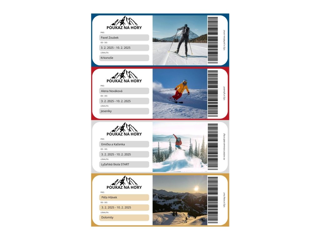 Narozeniny a svátky • Vánoce • Svatba • Narození miminka • Káva, benzin, překvapení • Vstupenky • Letenky • Dětské motivy • Hory • Lyžování