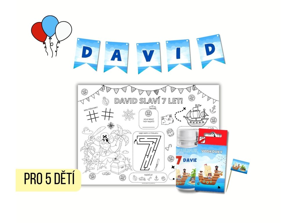 Narozeninová sada pro 5 dětí s personalizovanou girlandou, balónky, bublifuky a voskovkami. Každé dítě má vlastní set aktivit, připravíte oslavu za pár minut.