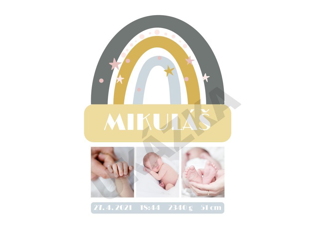 Personalizovaný plakát je dokonalou dekorací do dětského pokoje a krásným dárkem pro novopečené rodiče. Zaznamená údaje o narození dítěte – jméno, datum, čas, váhu a délku – a uchovává vzpomínky na tyto jedinečné okamžiky prostřednictvím 3 malých fotografií.