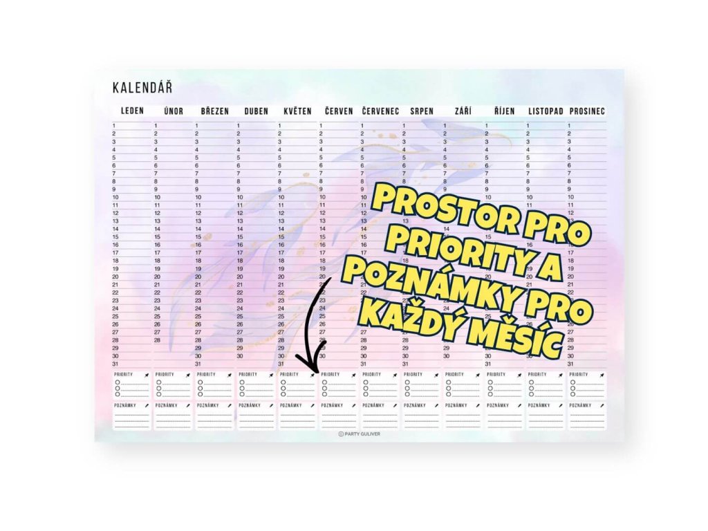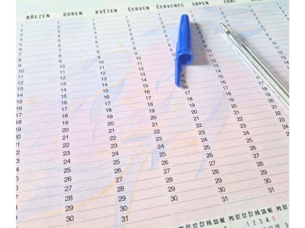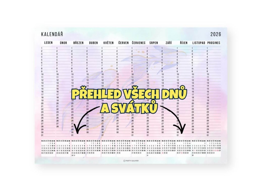 Roční kalendář v PDF formátu na celý rok na jedné stránce. Vidíš všechny měsíce najednou, označíš důležité termíny, napíšeš si snadno poznámky. Stáhneš okamžitě po objednání, vytiskneš doma, v copy centru nebo použiješ jako digitální plánovač a máš přehled, co tě čeká. Formát A3 i A4 na šířku + BONUS datovaný kalendář 2026 a stránka s přehledem státních svátků a informací, kdy mají obchody nad 200m2 v ČR otevřeno.
