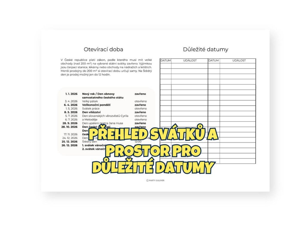 Ano. V datovaném kalendáři 2026 jsou svátky zvýrazněné červeně ve spodní části každého měsíce. Součástí balíčku je také bonusová PDF strana s přehledem všech svátků a informací o otevírací době velkých obchodů.