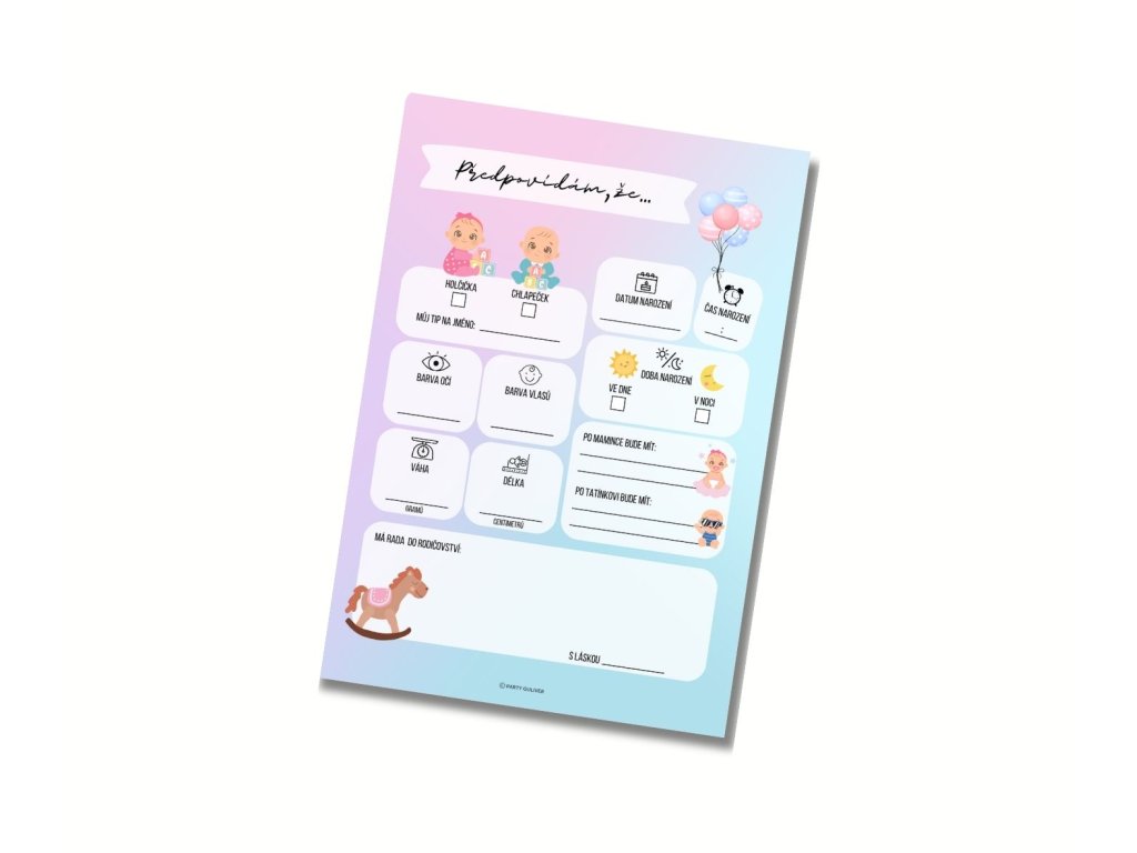 Zapojte hosty do zábavného hádání ohledně vašeho nenarozeného miminka! Dostupné ve 2 variantách. Tipovací dotazník prověří jejich intuici a odhad. Trefí datum narození, porodní váhu i další detaily miminka?